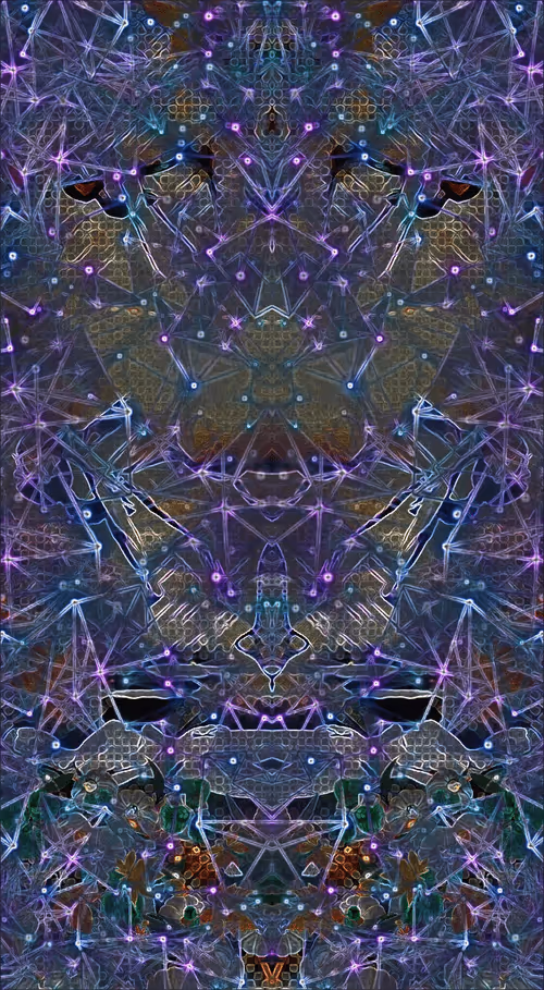 This luminous digital composition immerses the viewer in a deep, meditative world dominated by rich shades of violet and indigo. The artwork is constructed with intricate geometric patterns—grids, intersecting lines, and layered polygons—that build a sense of depth and complexity, drawing the eye inward. These structures are not static; they seem to shift and breathe with the presence of scattered glowing dots, which move rhythmically through the space, echoing a constellation or digital aura. Amid the abstract architecture, a subtle but powerful form begins to reveal itself—a lion’s head, seamlessly integrated within the geometry. It does not impose; rather, it emerges softly, like a vision caught between dimensions. This hidden symbol imbues the piece with a spiritual undertone, suggesting guardianship, latent power, and a metaphysical essence woven into the digital fabric. The contrast between rigid structure and organic suggestion creates a compelling duality: control versus instinct, clarity versus mystery. The deep violet tones contribute to the dreamlike atmosphere, offering a sense of calm introspection while the luminous accents provide energy and life. This artwork operates on multiple levels—it is at once a study in abstract design, a symbolic gesture, and an emotional landscape. Viewers are invited to pause and interpret freely, uncovering meaning within the layers. It stands as a testament to the fusion of digital precision with imaginative vision, offering a space where strength and stillness converge in elegant harmony.